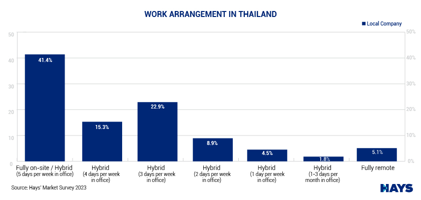The Hays study observes that majority of employees have resumed a fully on-site work arrangement. The top two work arrangements being fully on-site or 3 days per week in office.