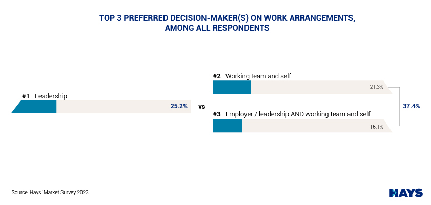 Opinions regarding who should establish the organisation’s work arrangement policy were divided among respondents. 25.2% say this is up to the sole discretion of leadership, whilst 37.4% believe it should be a shared decision-making process. Notedly, only 3.9% say it